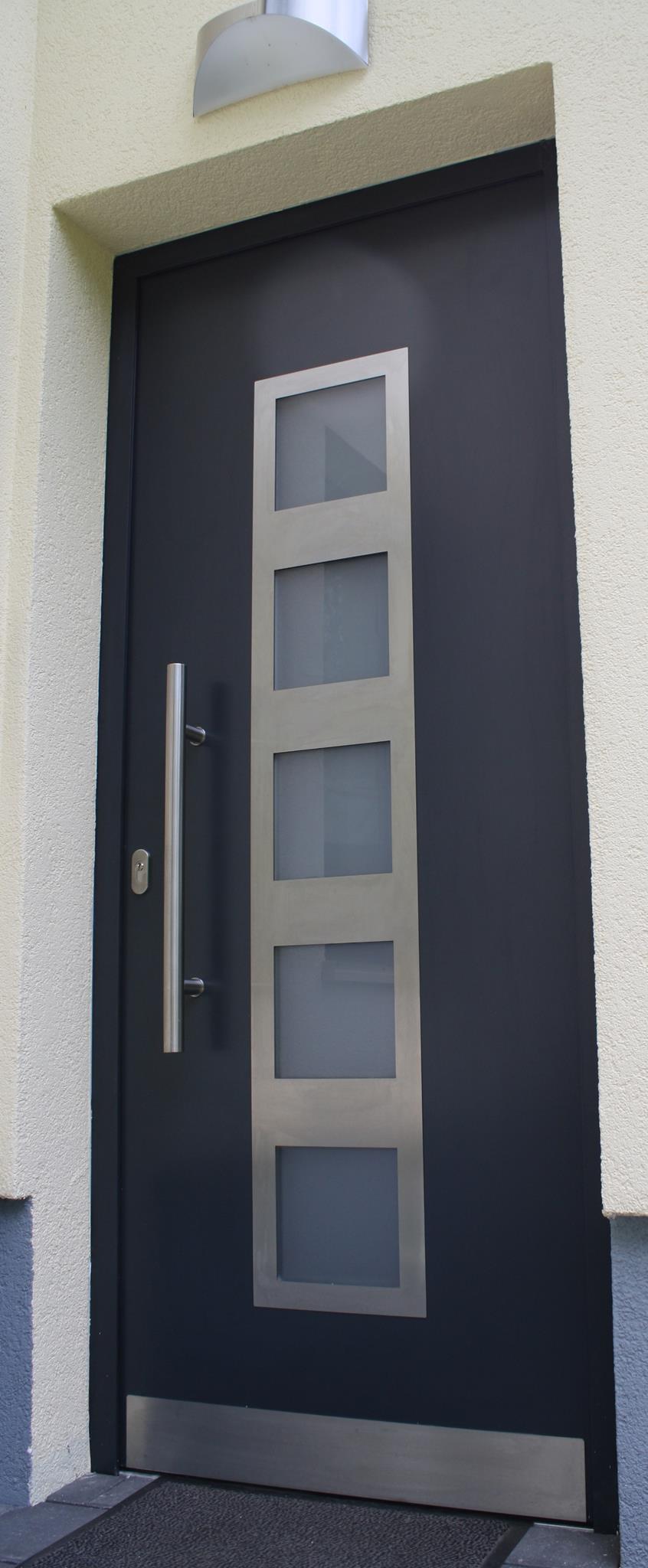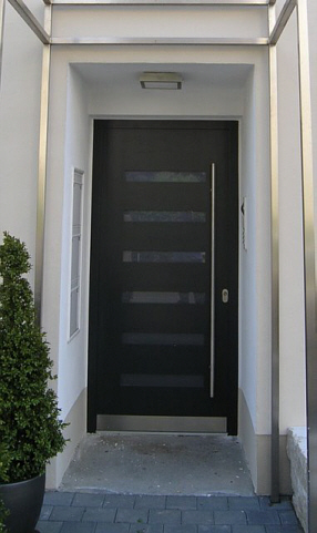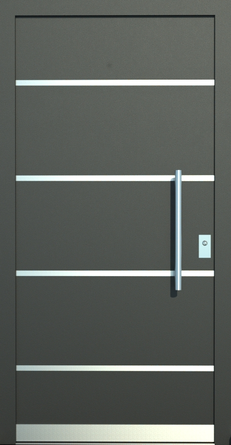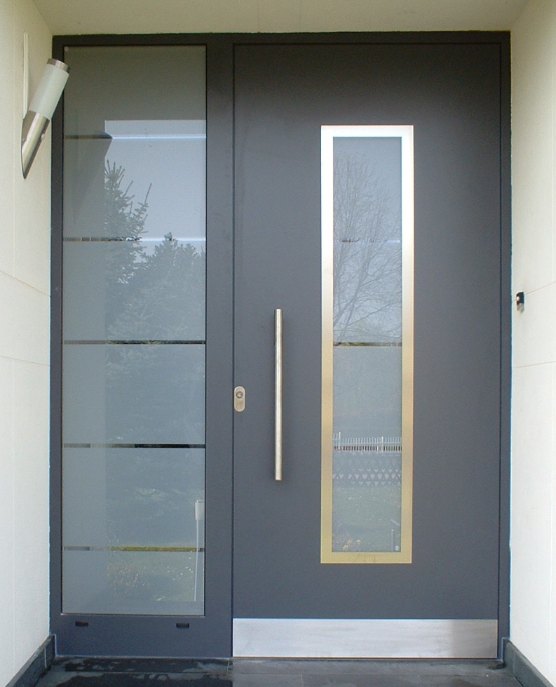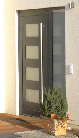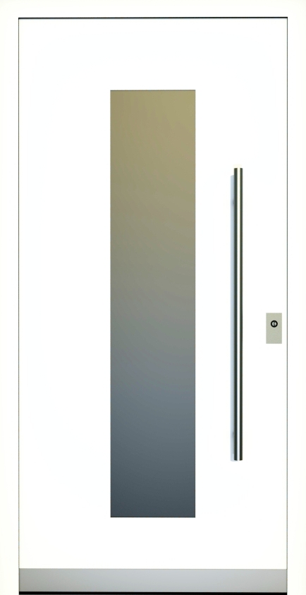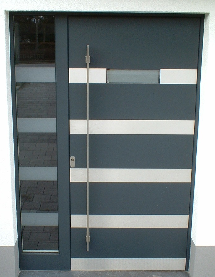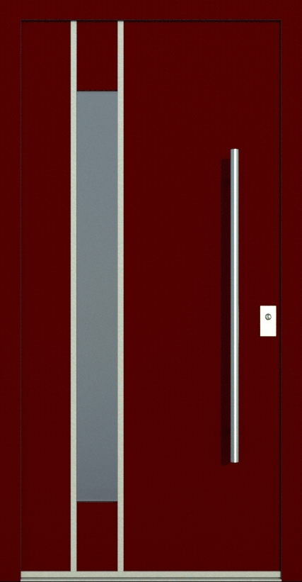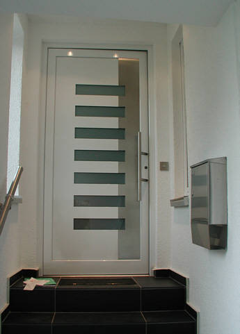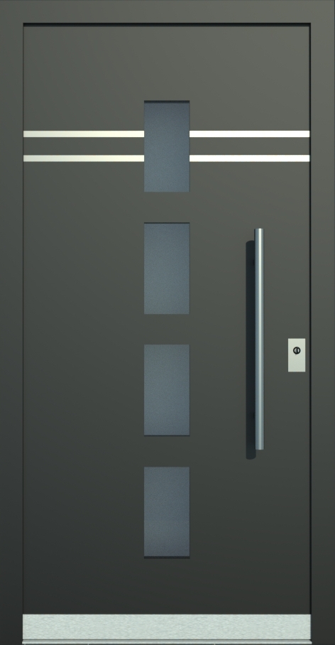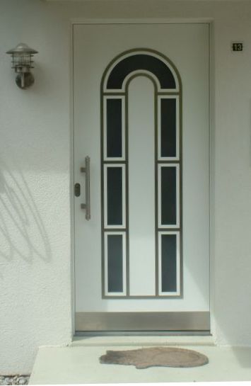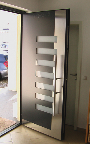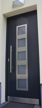 Aluminiumhaustüren mit flächenbündigen Edelstahldesign. Durch die gebrauchstmustergeschützte Abklebetechnik bei der Modellreihe Alu Fina wird ein nahezu nahtloser Übergang von Edelstahl zur Farbbeschichtung erreicht und somit unangenehme Schmutzkanten vermieden. Wählen Sie zwischen verschiedenen Farben und Ornamentverglasungen, bzw. Glasdesign (sandgestrahlte klare Muster).
