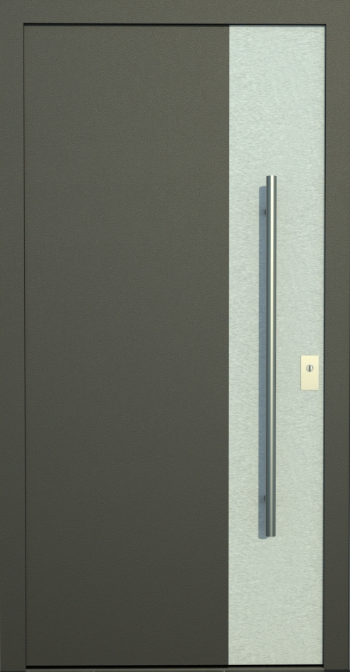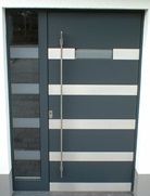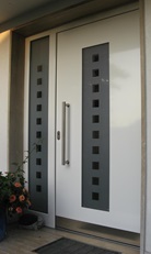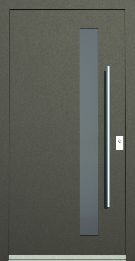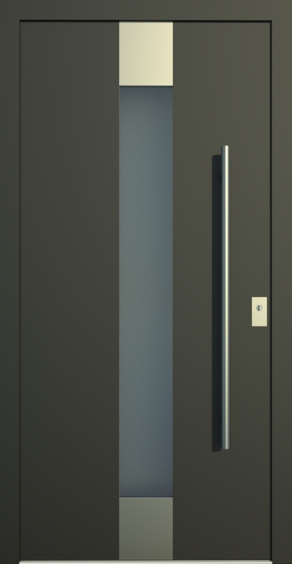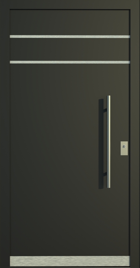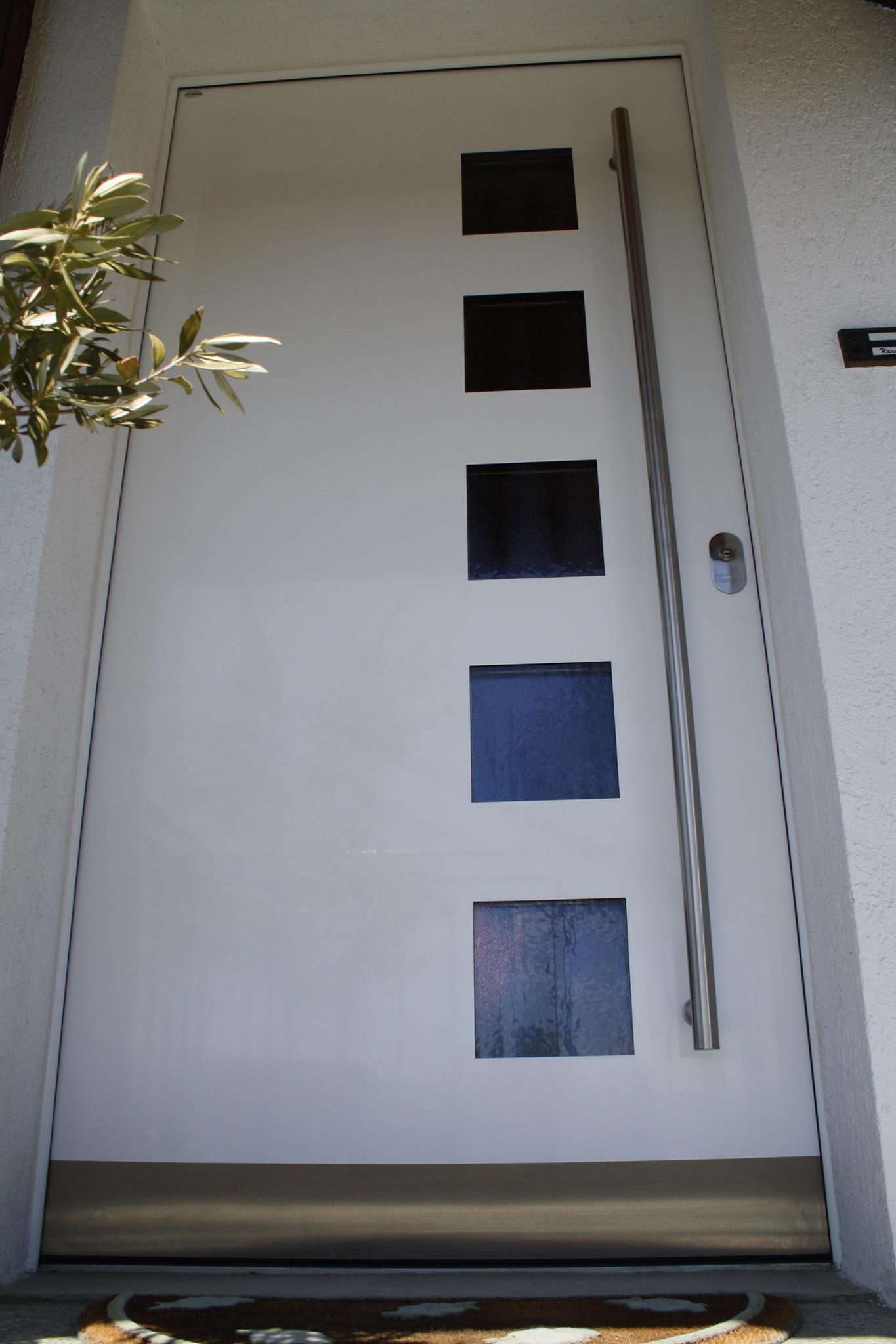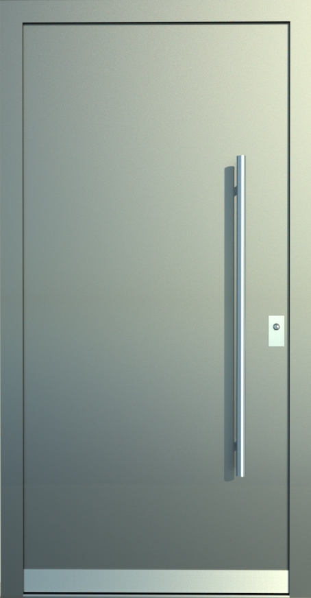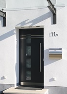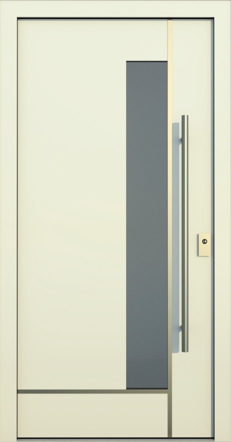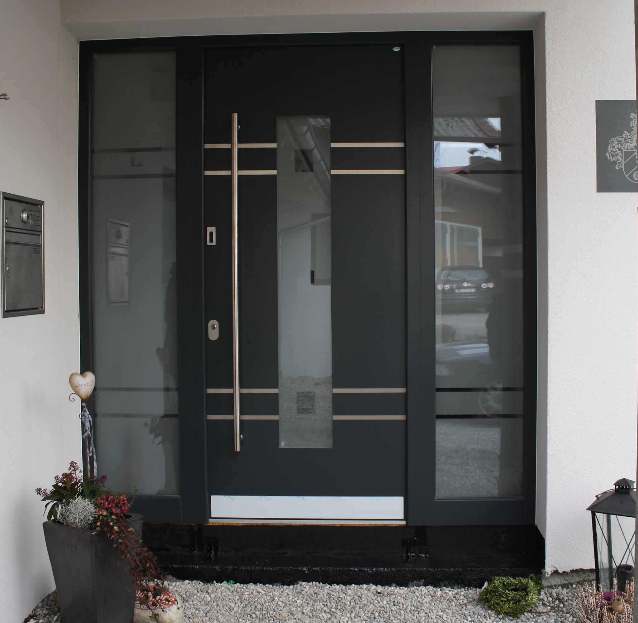 Aluminiumhaustüren mit flächenbündigen Edelstahldesign. Durch die gebrauchstmustergeschützte Abklebetechnik bei der Modellreihe Alu Fina wird ein nahezu nahtloser Übergang von Edelstahl zur Farbbeschichtung erreicht und somit unangenehme Schmutzkanten vermieden. Wählen Sie zwischen verschiedenen Farben und Ornamentverglasungen, bzw. Glasdesign (sandgestrahlte klare Muster).