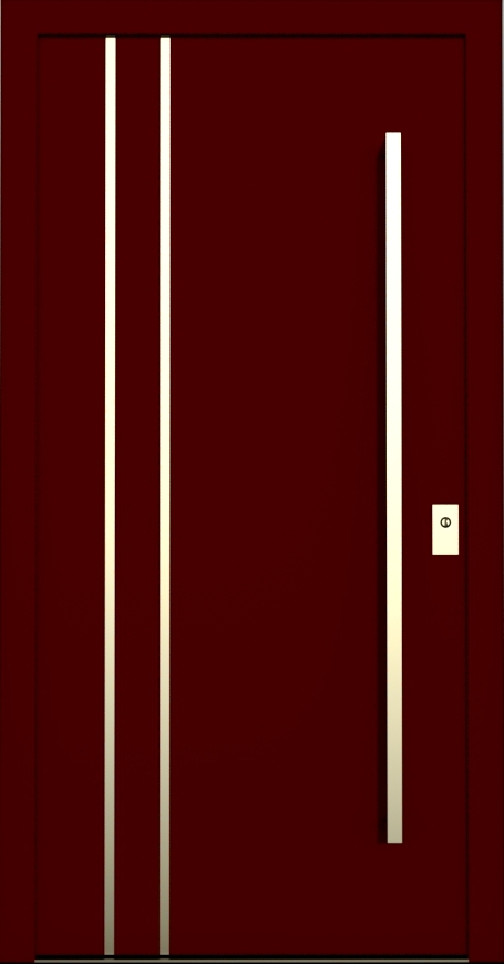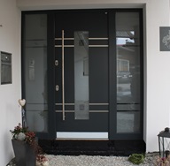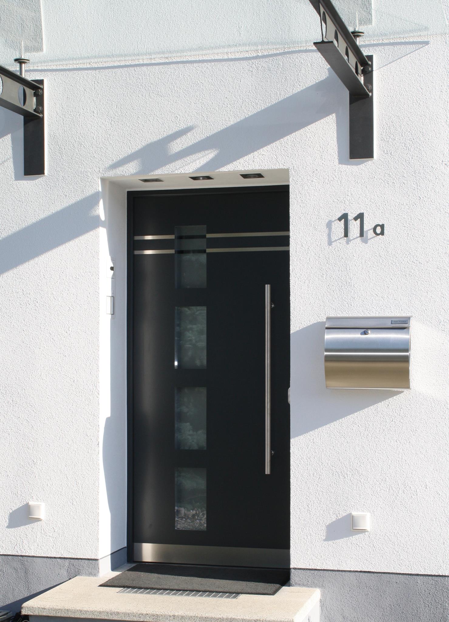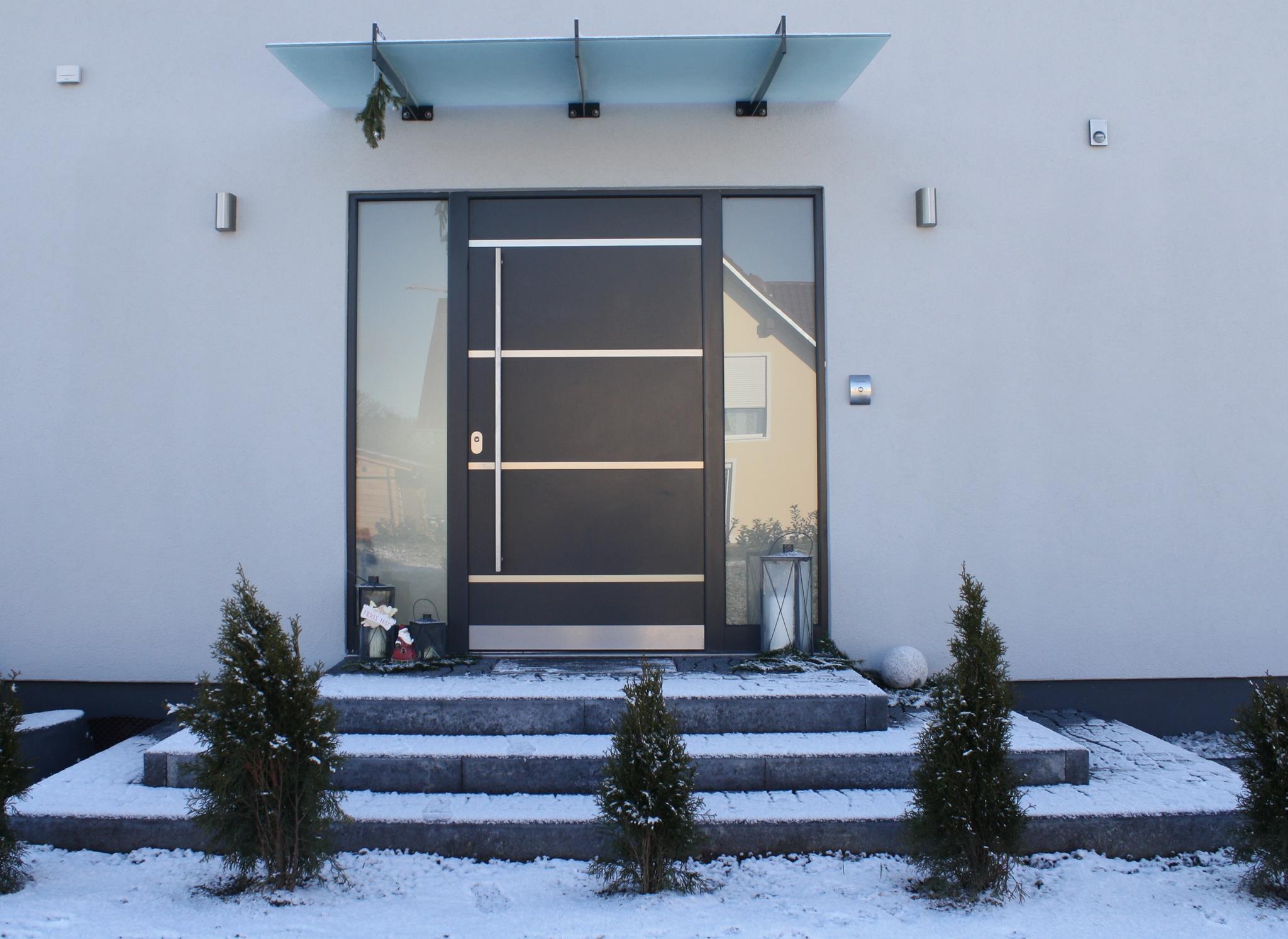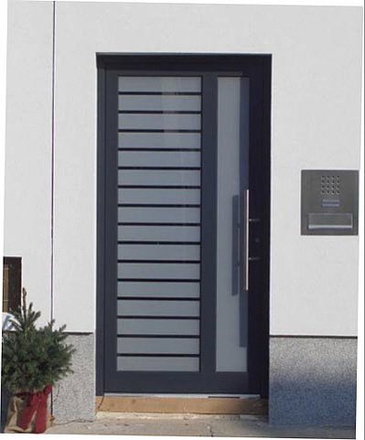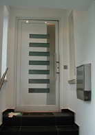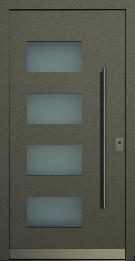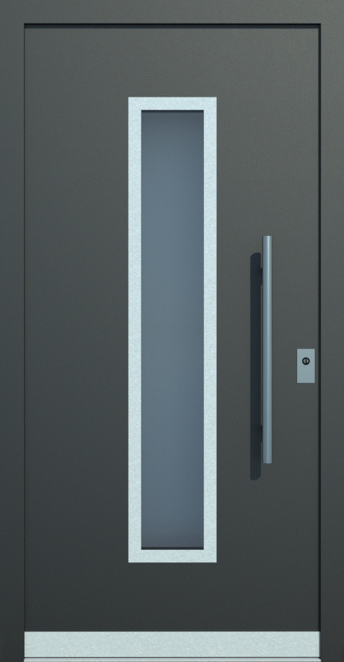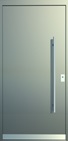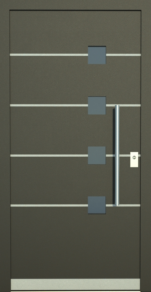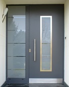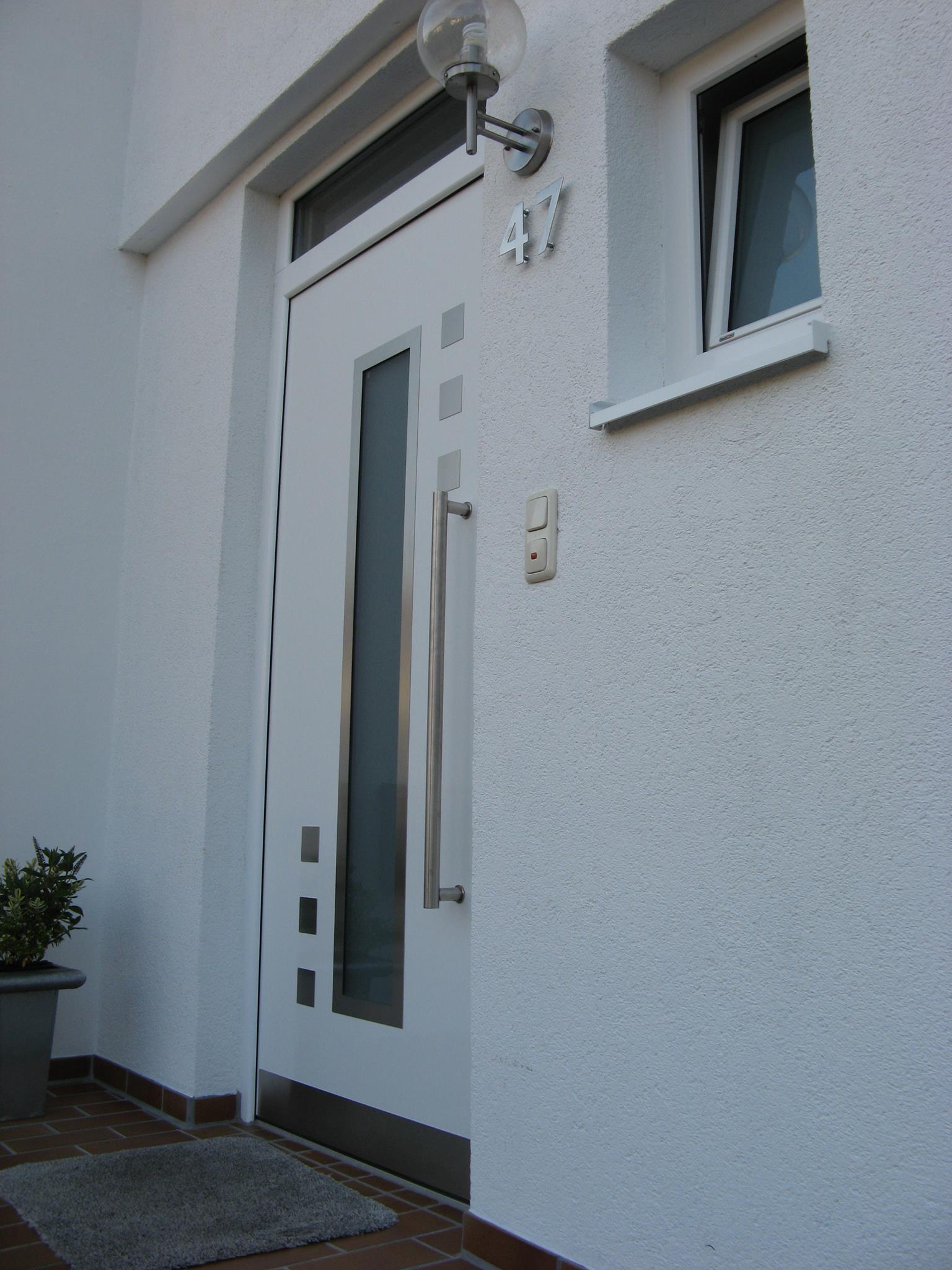 Aluminiumhaustüren mit flächenbündigen Edelstahldesign. Durch die gebrauchstmustergeschützte Abklebetechnik bei der Modellreihe Alu Fina wird ein nahezu nahtloser Übergang von Edelstahl zur Farbbeschichtung erreicht und somit unangenehme Schmutzkanten vermieden. Wählen Sie zwischen verschiedenen Farben und Ornamentverglasungen, bzw. Glasdesign (sandgestrahlte klare Muster).