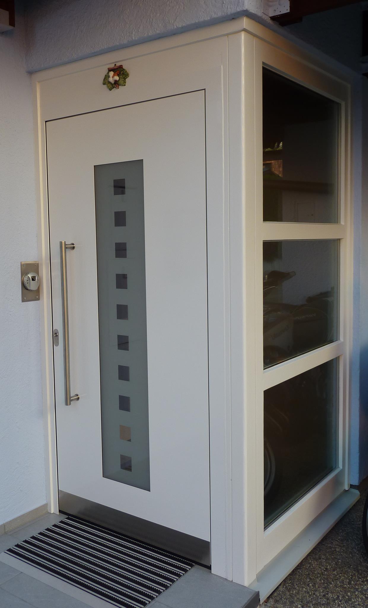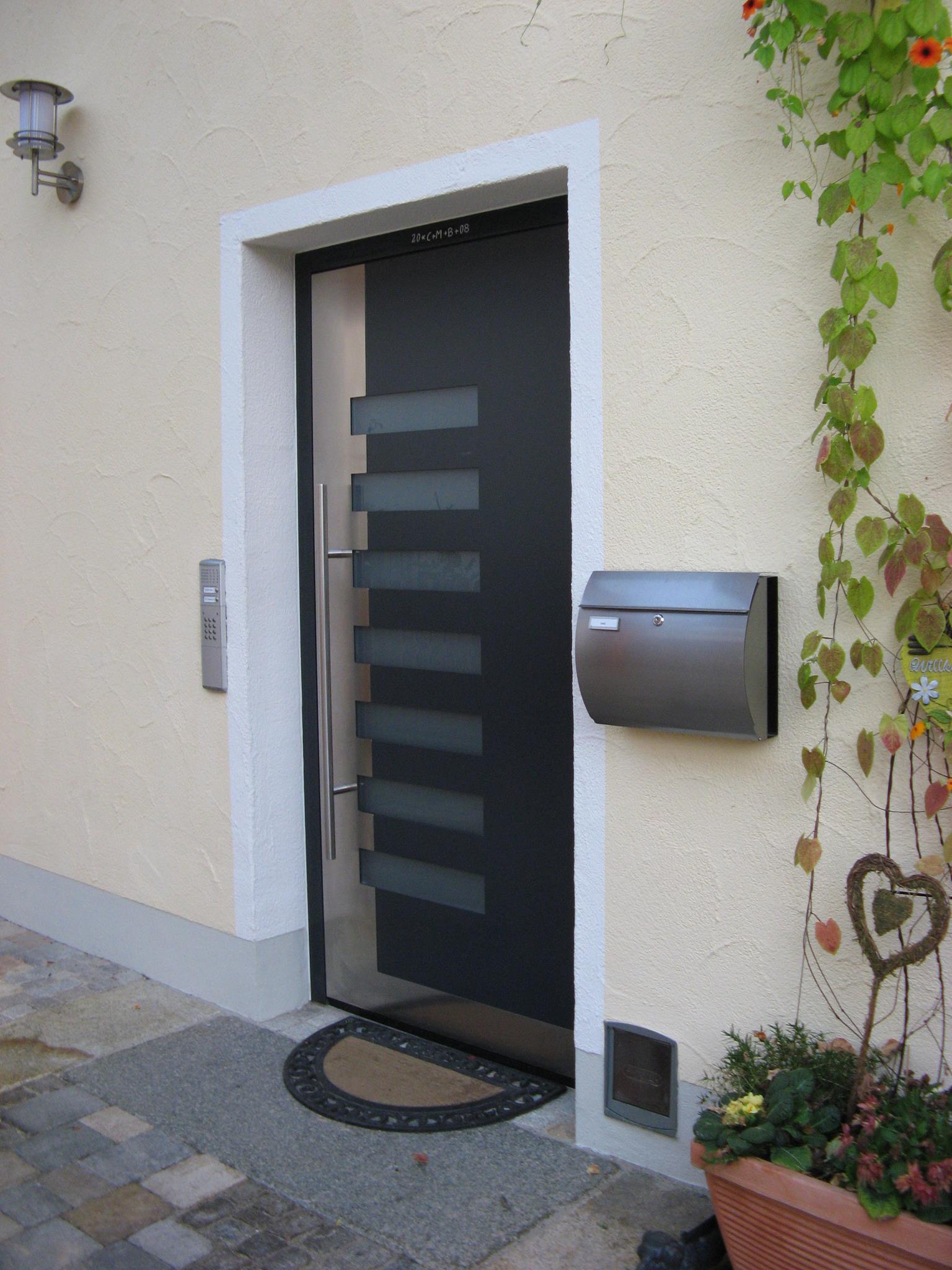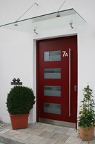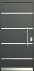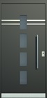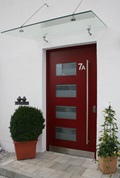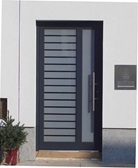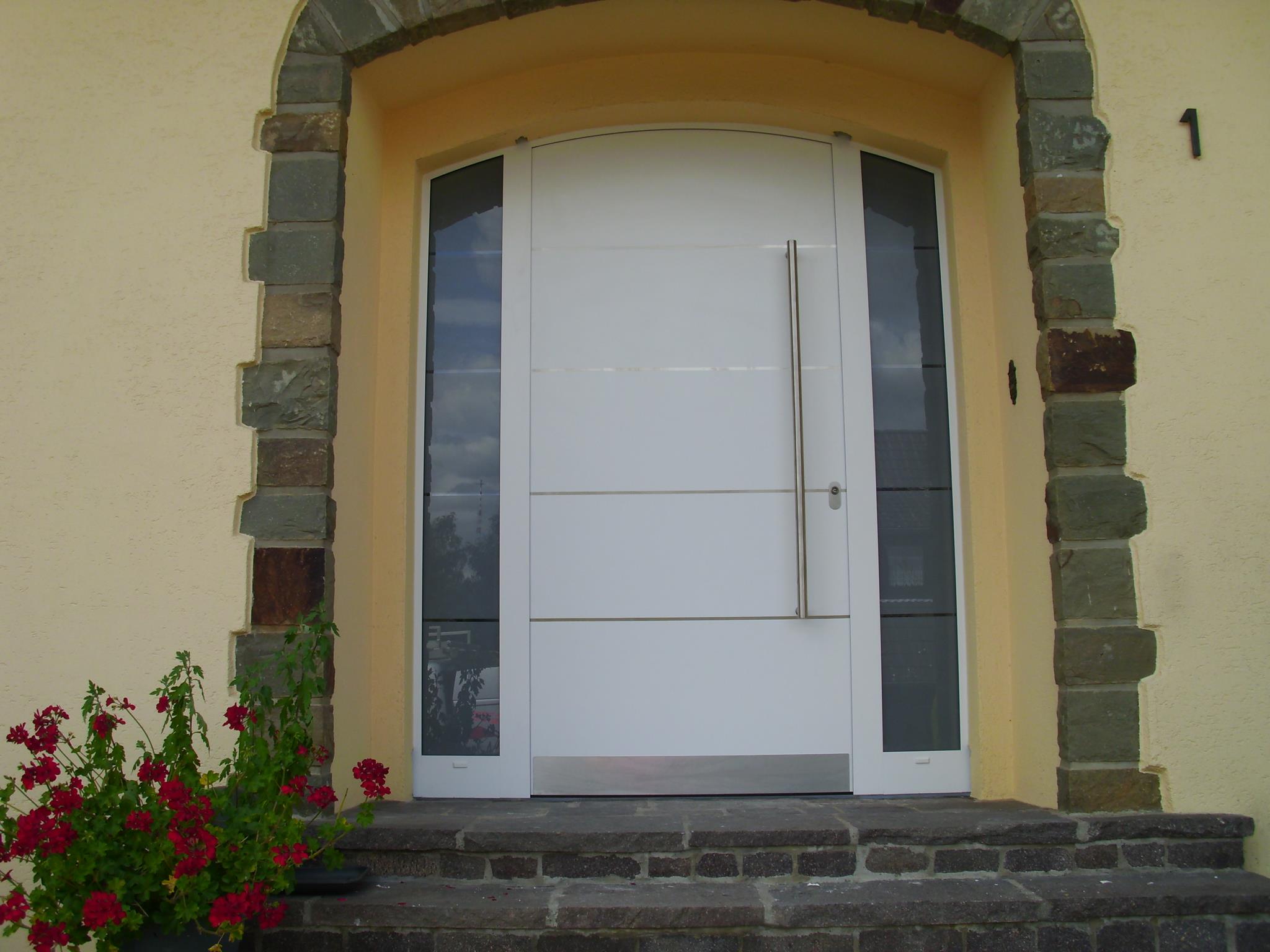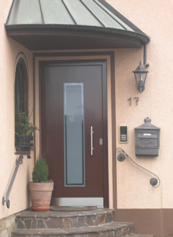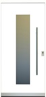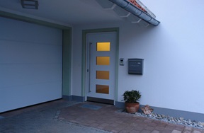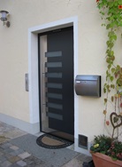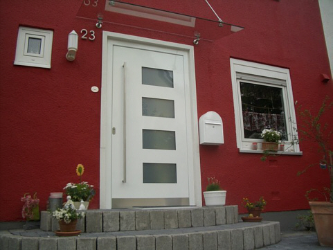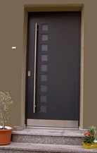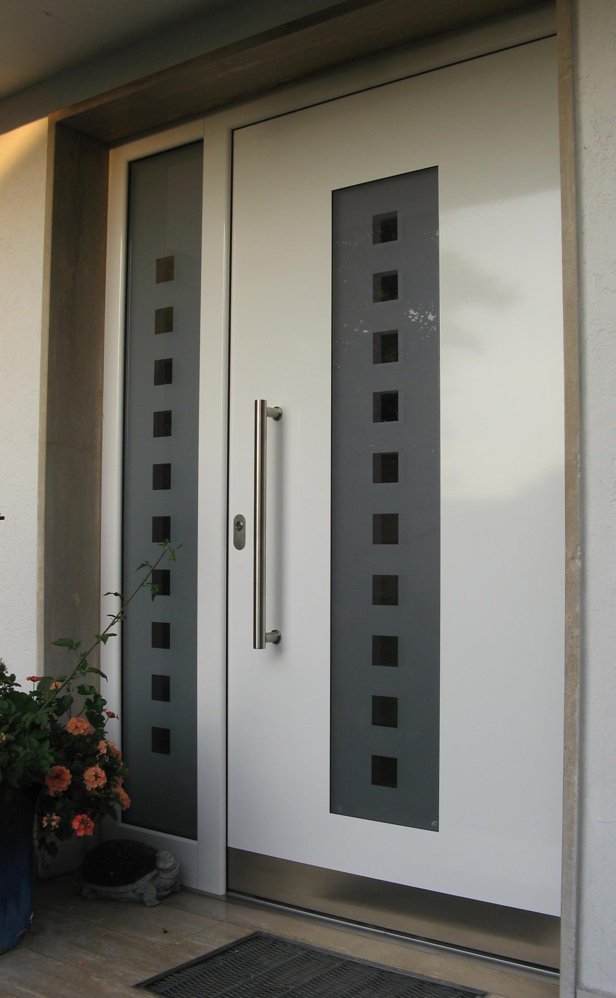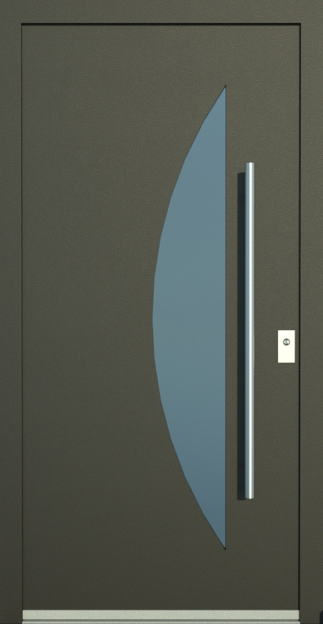 Aluminiumhaustüren mit flächenbündigen Edelstahldesign. Durch die gebrauchstmustergeschützte Abklebetechnik bei der Modellreihe Alu Fina wird ein nahezu nahtloser Übergang von Edelstahl zur Farbbeschichtung erreicht und somit unangenehme Schmutzkanten vermieden. Wählen Sie zwischen verschiedenen Farben und Ornamentverglasungen, bzw. Glasdesign (sandgestrahlte klare Muster).