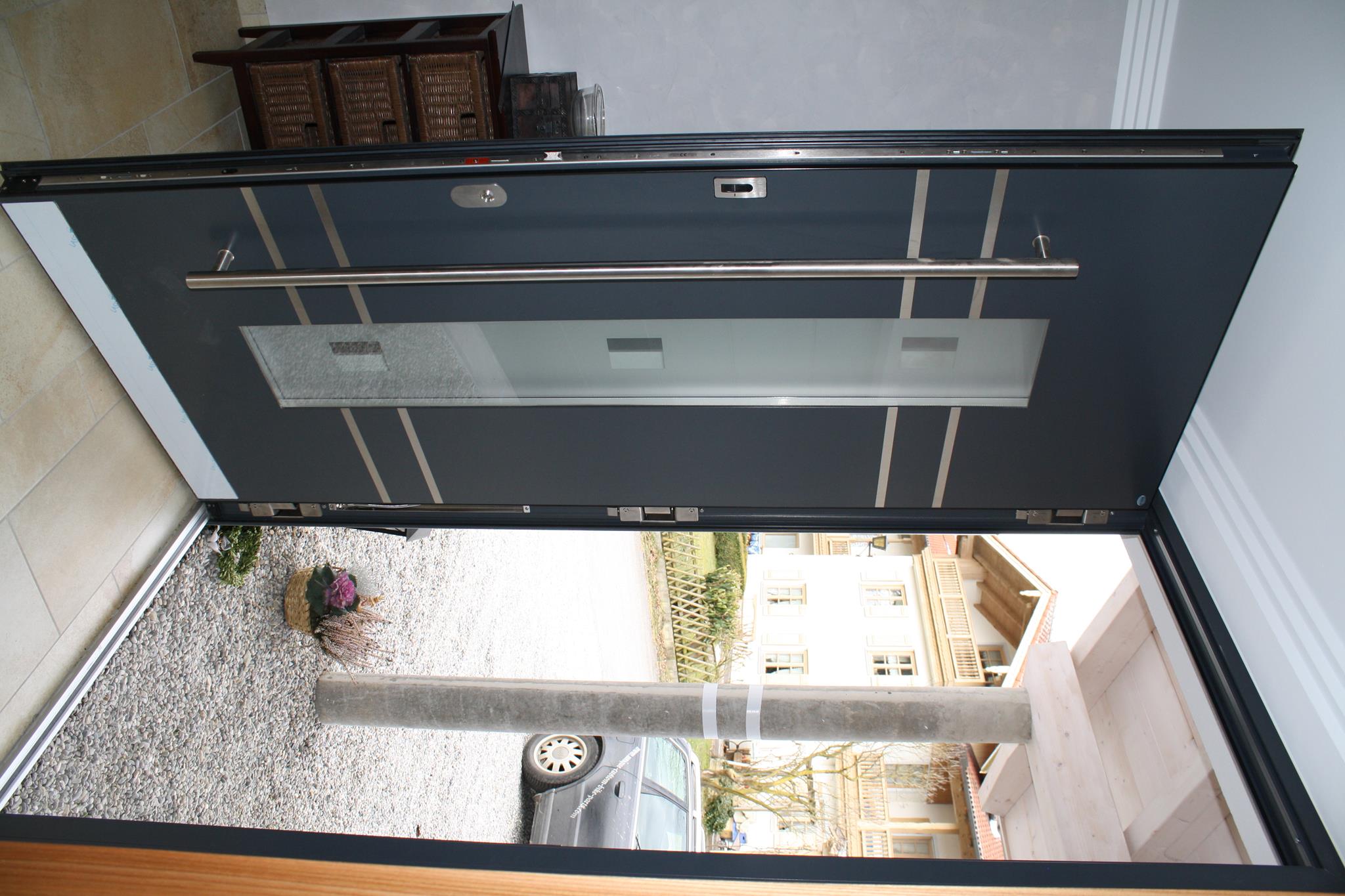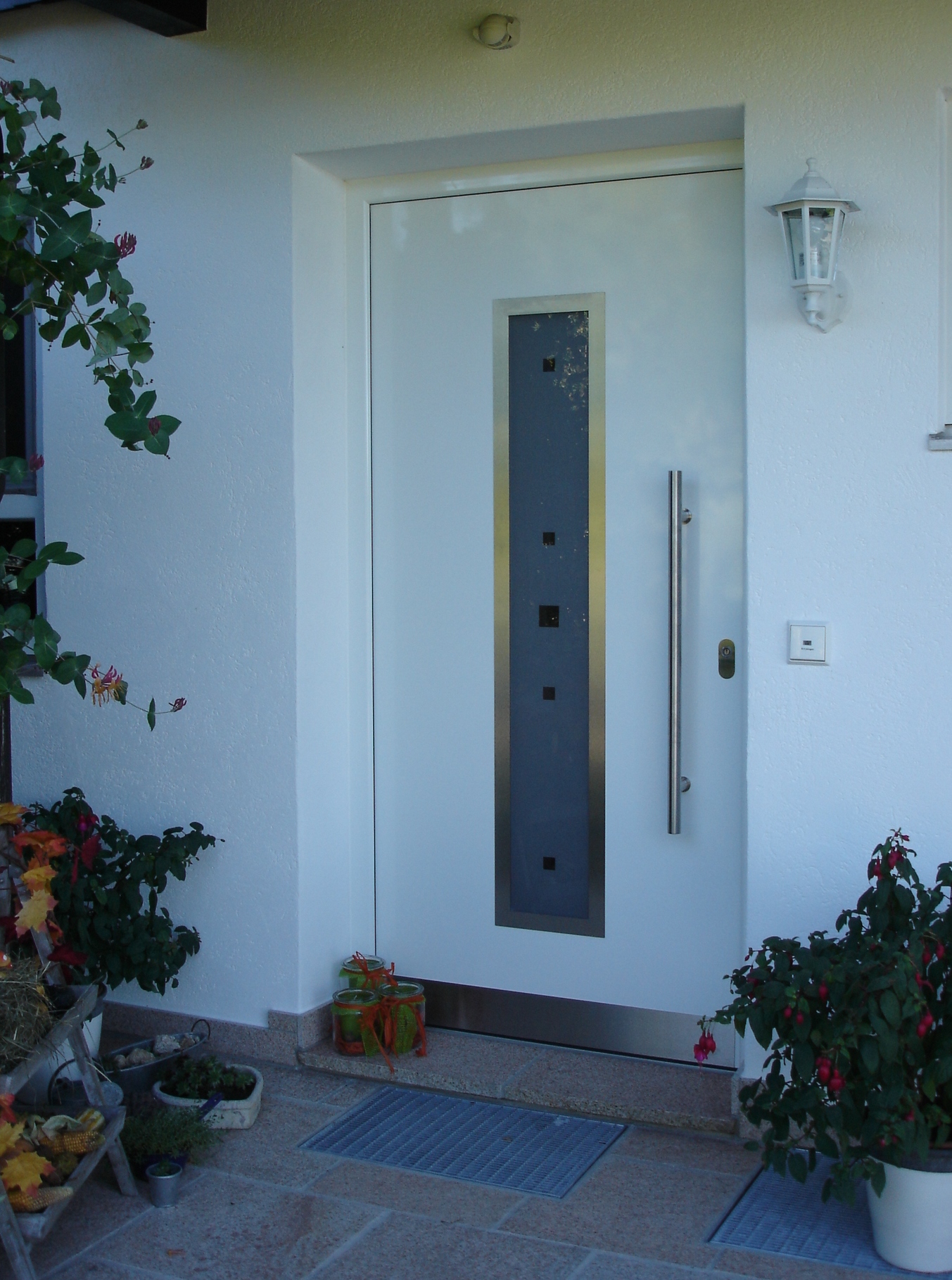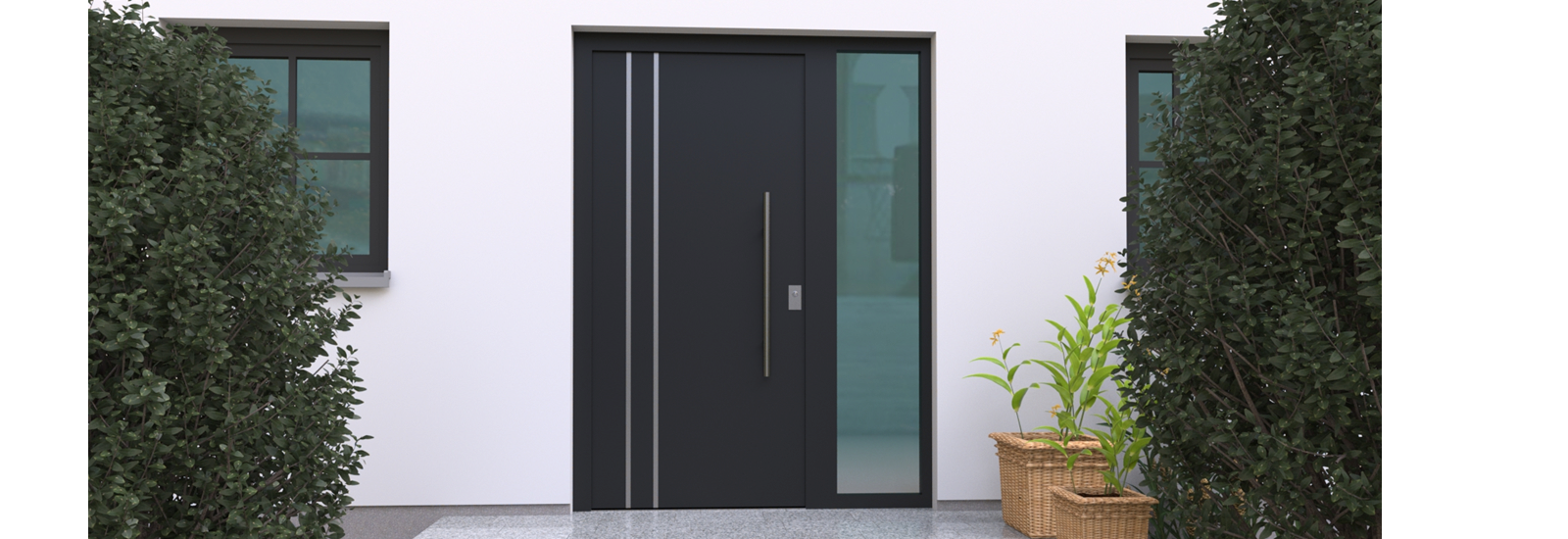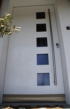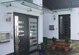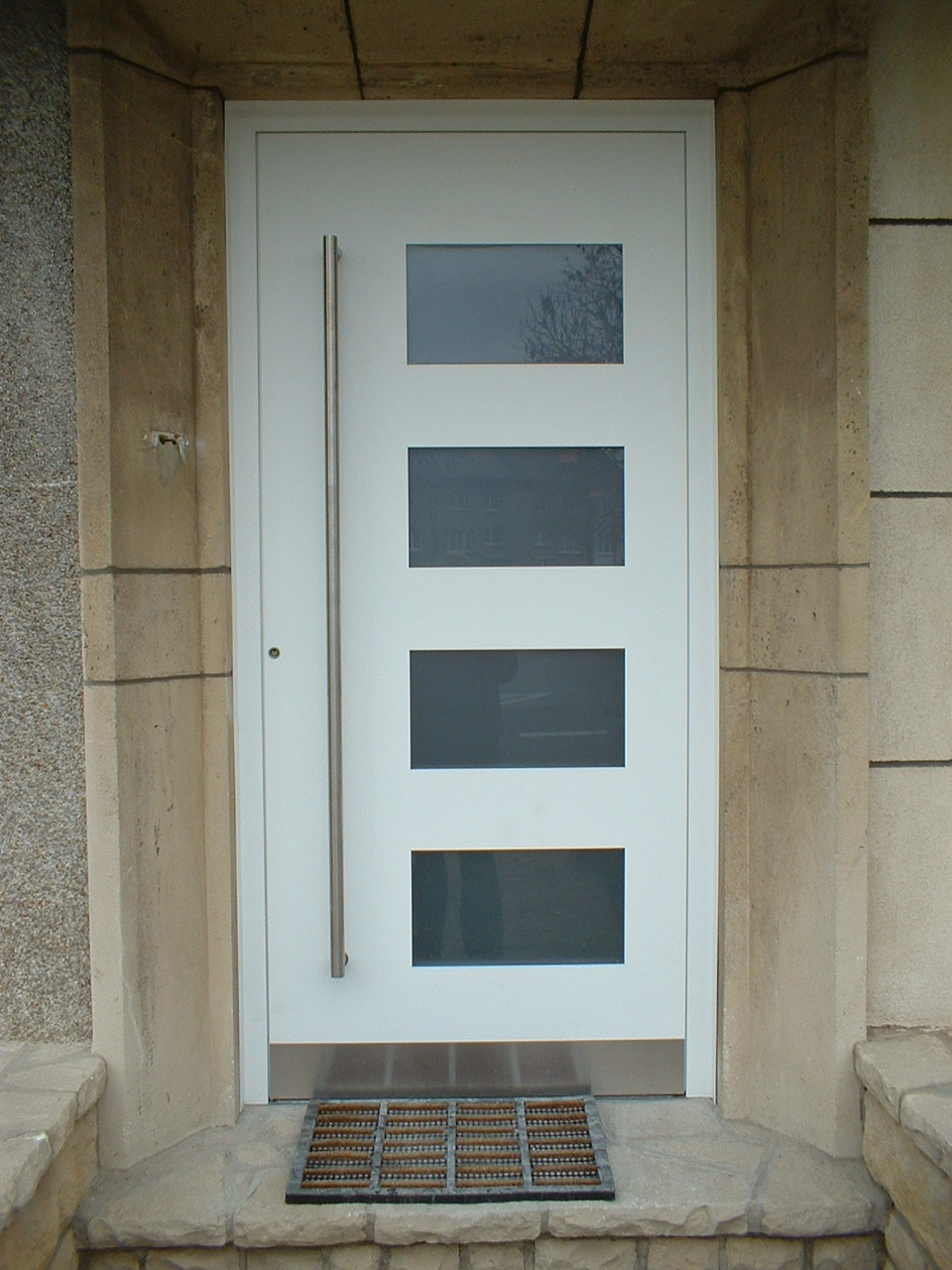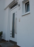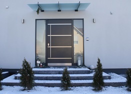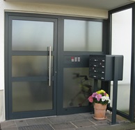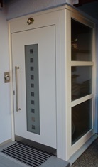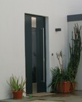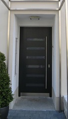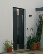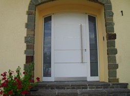Aluminiumhaustüren mit flächenbündigen Edelstahldesign. Durch die gebrauchstmustergeschützte Abklebetechnik bei der Modellreihe Alu Fina wird ein nahezu nahtloser Übergang von Edelstahl zur Farbbeschichtung erreicht und somit unangenehme Schmutzkanten vermieden. Wählen Sie zwischen verschiedenen Farben und Ornamentverglasungen, bzw. Glasdesign (sandgestrahlte klare Muster).