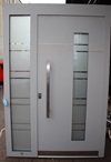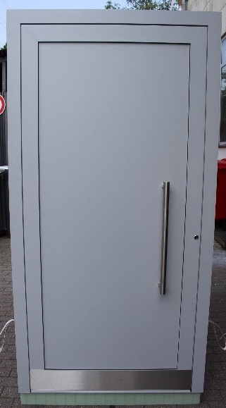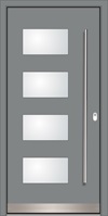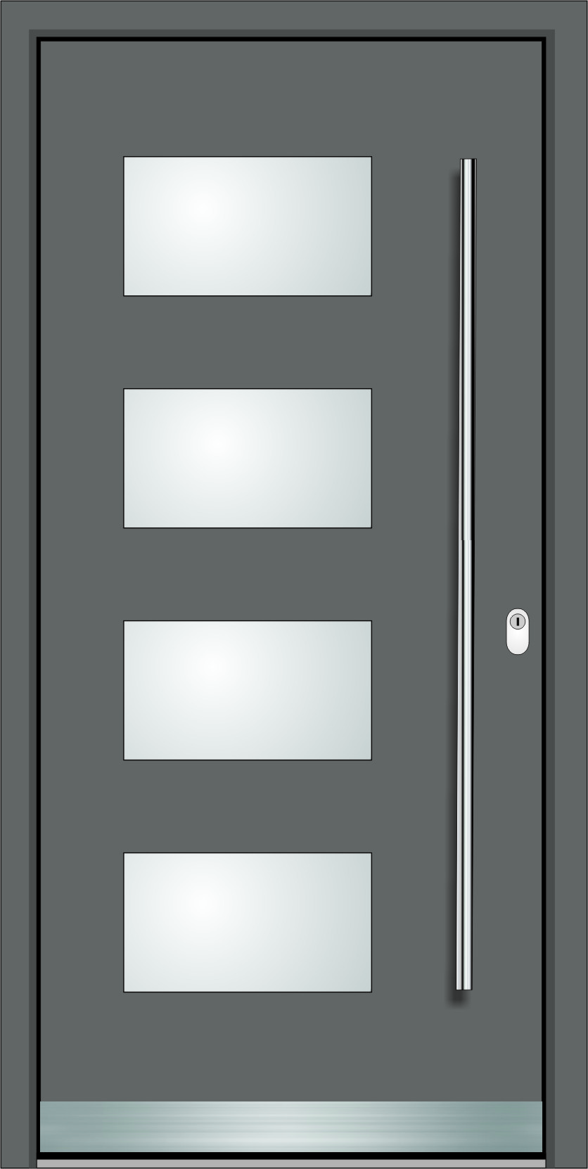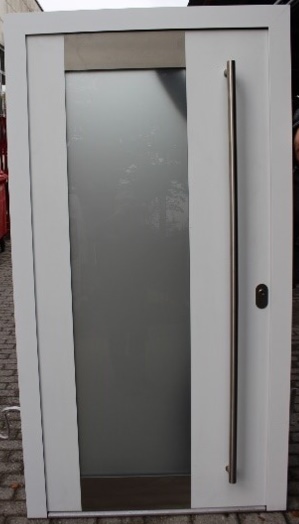 (heroal D72), zwei Anschlagdichtungen, Bautiefe 82mm, Flügelbautiefe 74 mm, beidseitig flügelüberdeckend, Füllung steht außen vor, 2 Stk. verdeckt liegende Türbänder IMB, 3-fach-Verriegelung Autosafe FUHR 833, außen Edelstahlgriff TG 1032K2 Länge: 300 mm, innen Edelstahl-Drücker 6000, RC2 Zylinder inkl. 3 Schlüssel, thermisch getrennte Schwelle aus Aluminium, Verglasung: 3-fach-Wärmeschutzglas 2x ESG Satinato/ 1x P4A, Edelstahl-Sockelblende außen flächenbündig Abklebetechnik Aludesign Nr. 02 (80 mm)