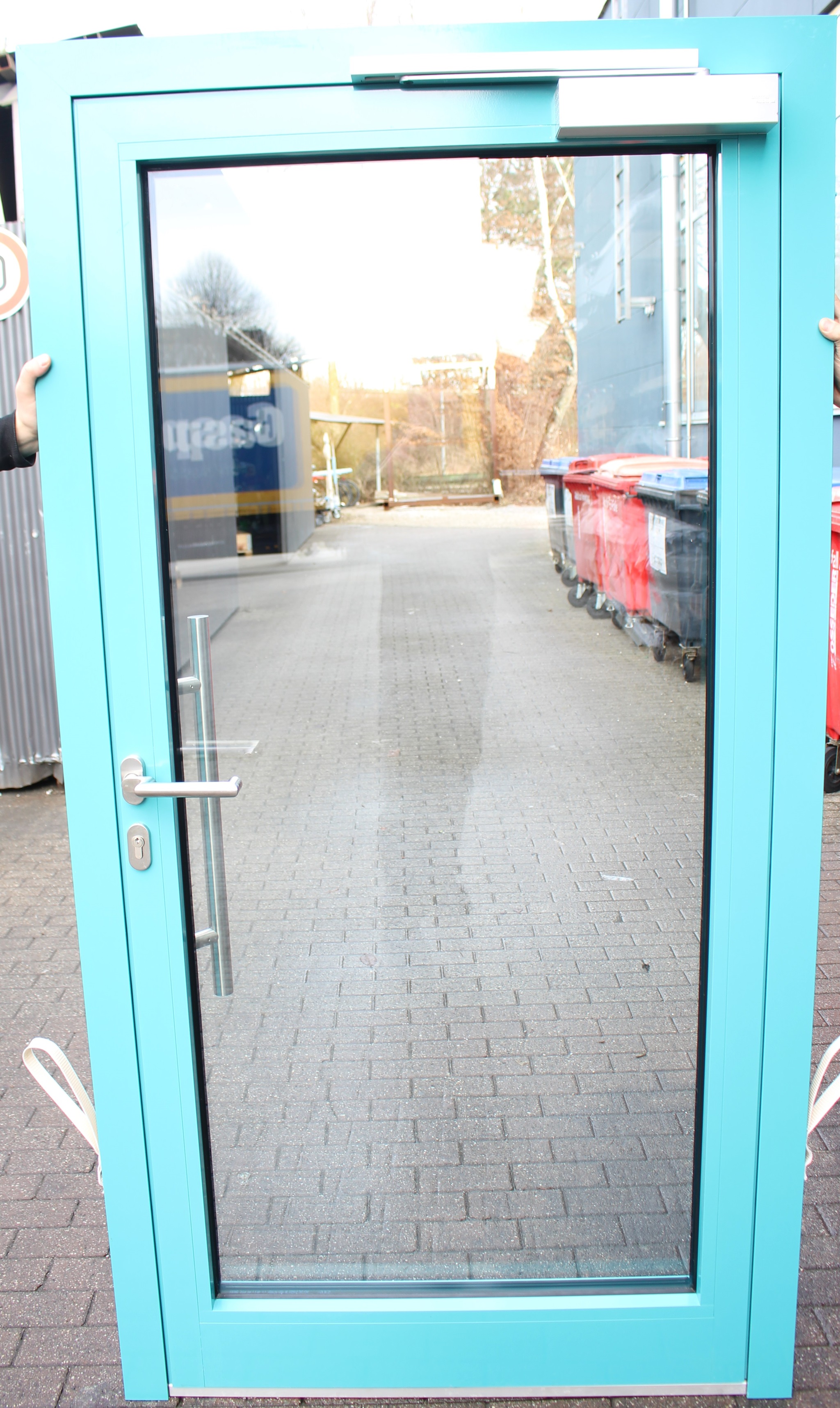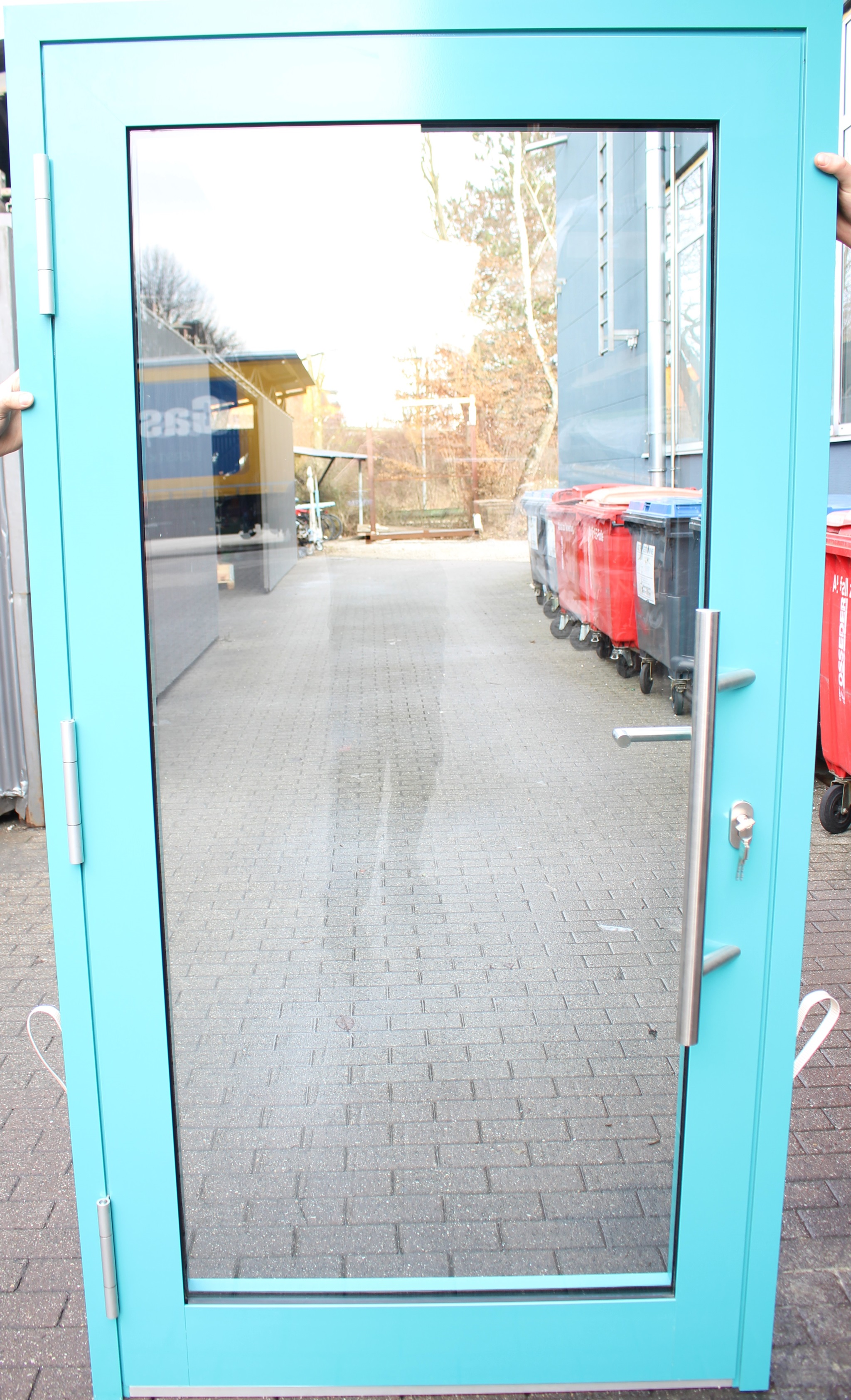 Maß: 1073 mm x 2040 mm, nach außen öffnend, DIN Links RAL 5018 türkisblau